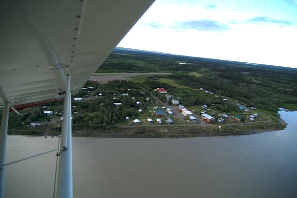ホワイトマウンテンを抜け、ユーコン川沿いを少し捜すと「ビーバー村」が現れます。新田次郎著「アラスカ物語」を読めば必ず行きたくなるこの村。上空から見るとわずかな集落があるだけの村ですが、周囲の景色であるツンドラをみると、物語のシーンがじわっと思い出されてきたりします。読んでいない方は、アラスカの地理を勉強するためにも?ぜひ一読をお勧めします。ちなみにこの村に限ったことではありあせんが現実的な交通手段は、飛行機だけです。